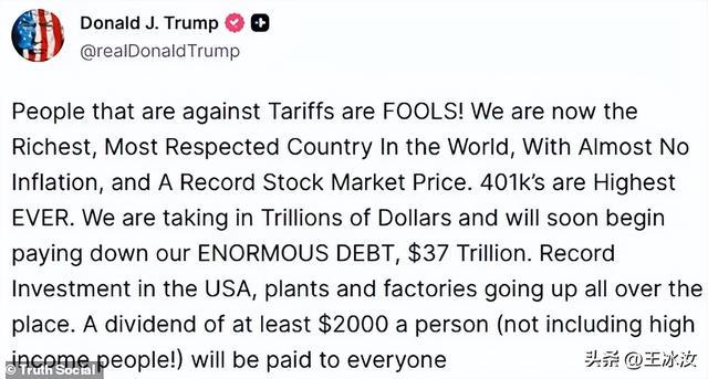 然而在政治层面,特朗普比任何人都懂得“叙事的魔力”。他把“国家”变成了一家“收益公司”,把“公民”变成“股东”,把“关税”包装成“利润”,再把“支票”作为“分红”。