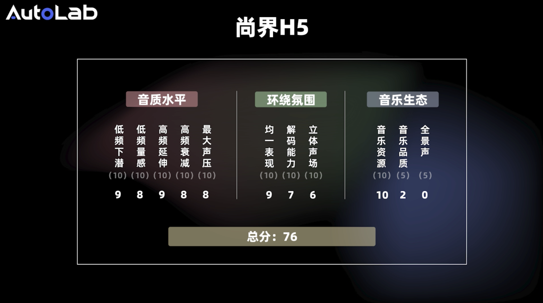最后,经过我们的实测,尚界H5在AudioLab 2.0的评分标准中获得了76分的总成绩。
