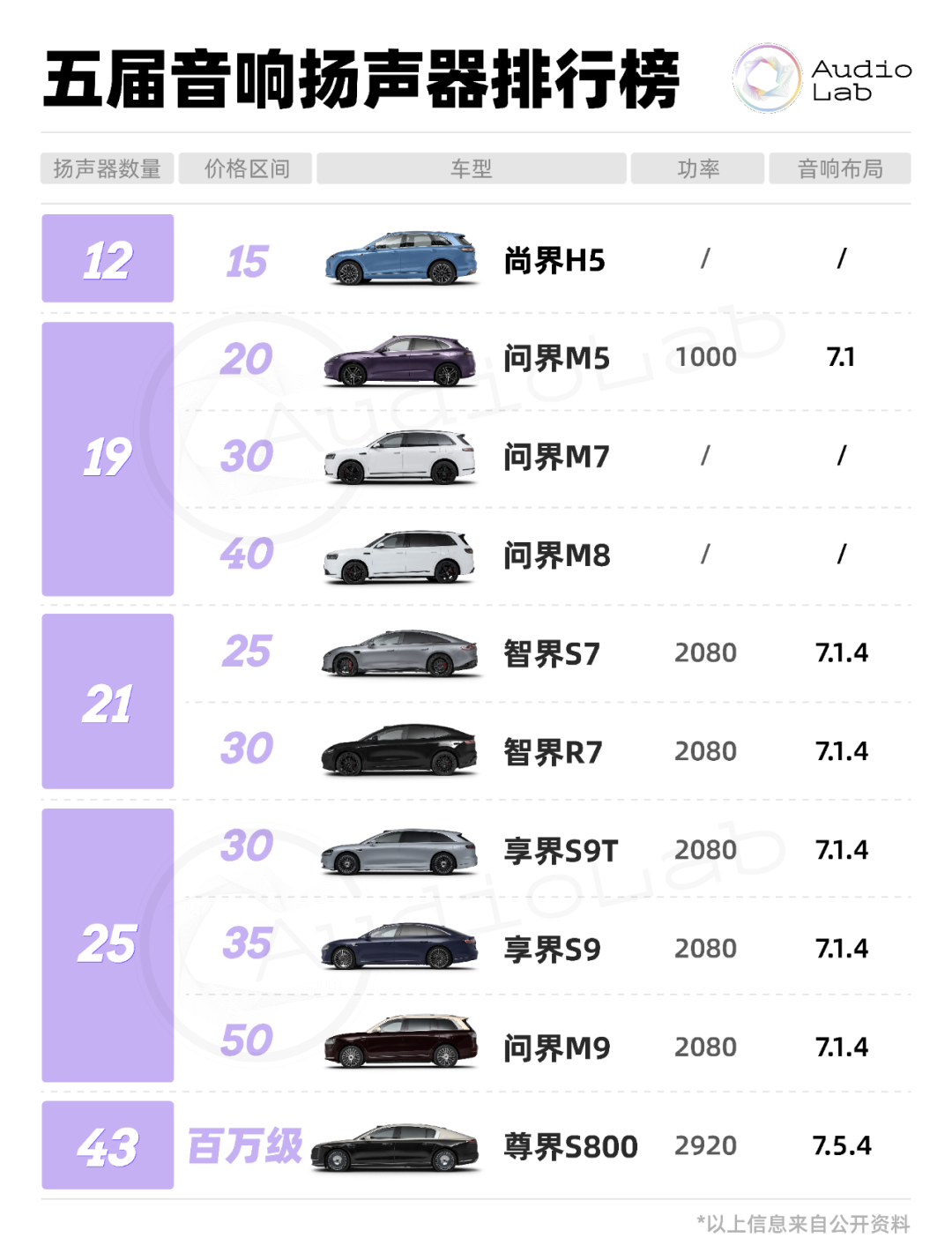 不过通过整理五界中不同产品的配置及定位,我们也猜测鸿蒙智行里也开始有清晰的音响等级,并且通过音响硬件配置来进行划分。